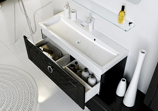 Описание: Тумба под умывальник подвесная, имеет выдвижной ящик полного выдвижения с системой плавного закрывания австрийской фирмы «BLUM» и разделением внутреннего пространства.