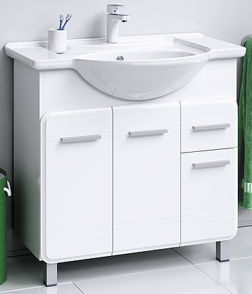 Описание: Тумба под умывальник с ящиком и распашными дверцами, опорные ножки.