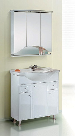 Описание: тумба на хромированных ножках, с раковиной (Стиль 75), с бельевой корзиной, ящиками и секциями для хранения.