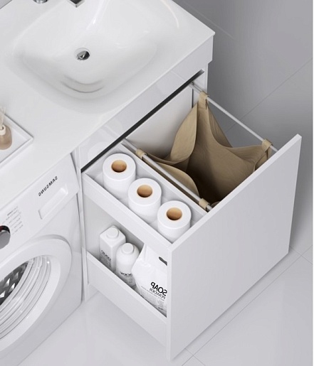 - Напольная тумба Forma, бельевая корзина справа и два отсека для хранения хозяйственных принадлежностей.