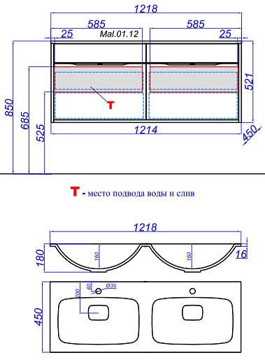 - двойная раковина Malaga 1200 Duet (арт. Mal.12.04.D), искусственный мрамор, цвет белый