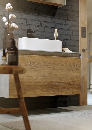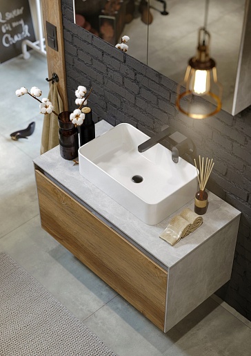 Описание: Коллекция Mobi гармонично вписывается в интерьер любой современной ванной комнаты. Так как существует возможность комбинировать фасады и корпуса трех цветов: бетон светлый, дуб балтийский и белый глянец. Подходит любой наставной умывальник. При этом умывальник может устанавливаться в любом месте, а не только центру.