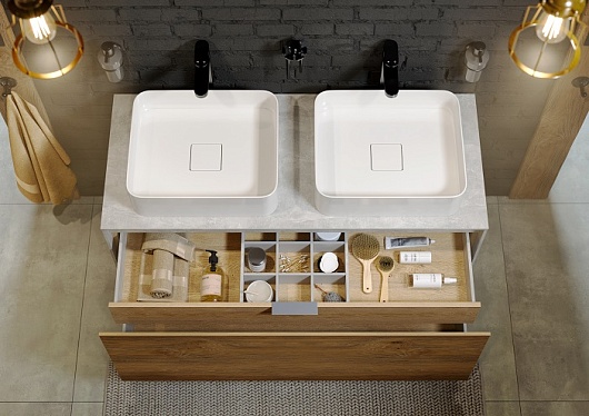 Описание: Коллекция Mobi гармонично вписывается в интерьер любой современной ванной комнаты. Так как существует возможность комбинировать фасады и корпуса трех цветов: бетон светлый, дуб балтийский и белый глянец. Подходит любой наставной умывальник. При этом умывальник может устанавливаться в любом месте, а не только центру.