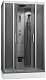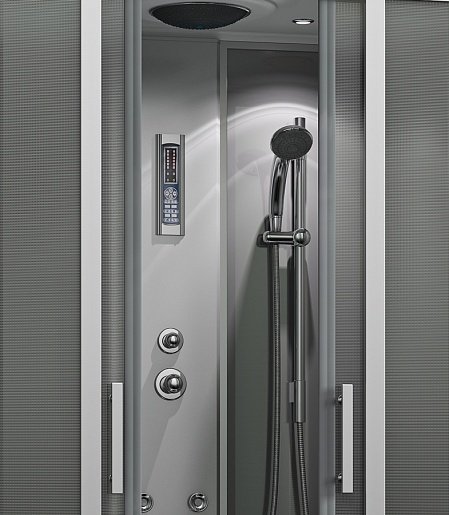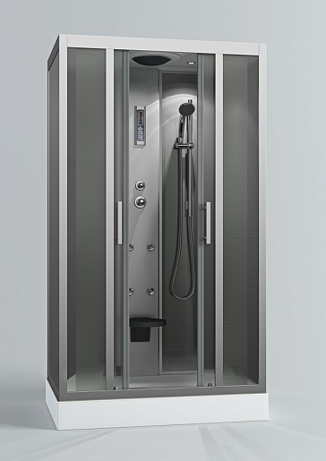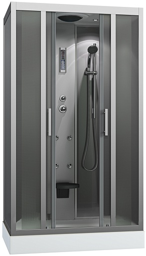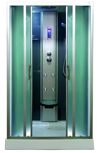Профиль душевой выполнен из хромированного алюминия, задние стёкла серебристого оттенка обладают высокой прочностью. Цвет передних стёкол – матовый. Среди дополнительных функций – встроенное радио, освещение и вентилятор. Имеется стеклянная полка для принадлежностей.оснащение: