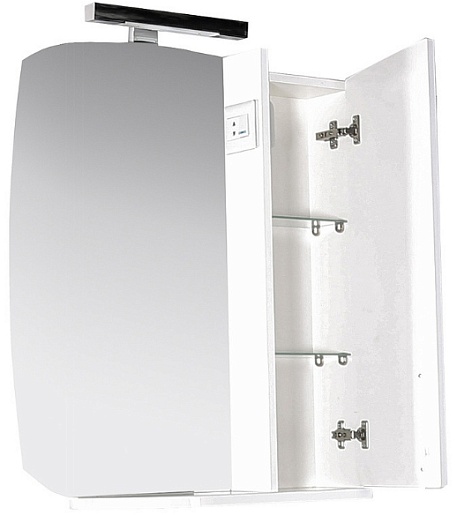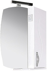 Описание: влагостойкая зеркальное полотно с фацетом с нижней полкой и светильником. Справа от зеркала расположен шкафчик с распашной дверцей, внутренними полками и выключателем с розеткой. Комбинированные ручки белый/хром имеют удобную для открывания форму. Покрытие фасада и корпуса - высокоглянцевая эмаль