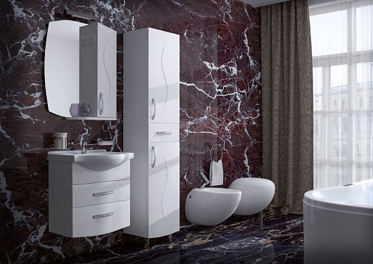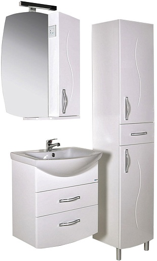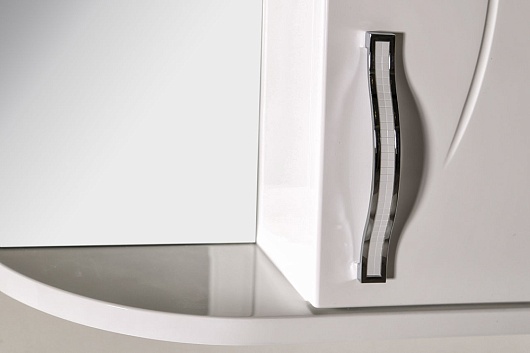Описание: влагостойкая зеркальное полотно с фацетом с нижней полкой и светильником. Справа от зеркала расположен шкафчик с распашной дверцей, внутренними полками и выключателем с розеткой. Комбинированные ручки белый/хром имеют удобную для открывания форму. Покрытие фасада и корпуса - высокоглянцевая эмаль