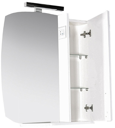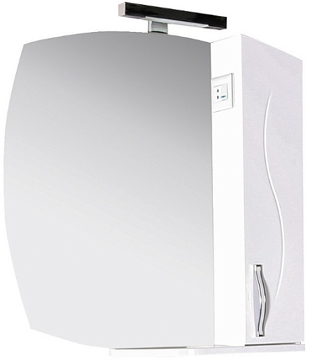 Описание: влагостойкая зеркальное полотно с фацетом с нижней полкой и светильником. Справа от зеркала расположен шкафчик с распашной дверцей, внутренними полками и выключателем с розеткой. Комбинированные ручки белый/хром имеют удобную для открывания форму. Покрытие фасада и корпуса - высокоглянцевая эмаль