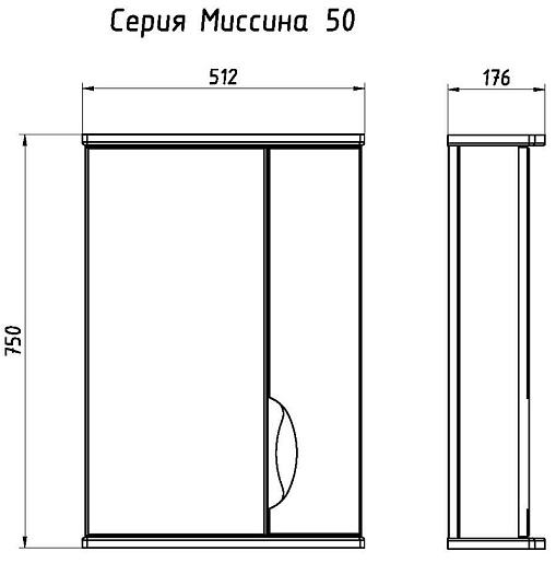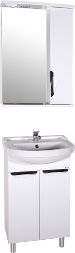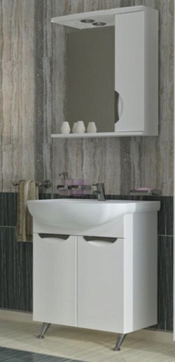 Описание: влагостойкое зеркальное полотно, справа шкафчик с распашной дверцей с доводчиками, полочка нижняя, встроенный в карниз светильник, розетка и выключатель.