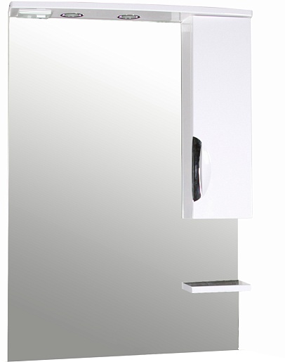 - Оснащение: влагостойкое зеркальное полотно, справа шкафчик с распашной дверцей с доводчиками, полочка, встроенные в карниз светильники, розетка и выключатель.