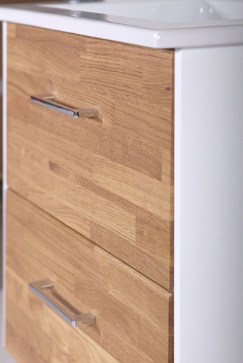 Описание: подвесная тумба из массива дуба и МДФ, с двумя выдвижными ящиками на доводчиках, прямоугольная раковина Оскар 85, фурнитура европейского производства.