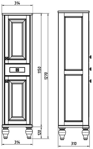 Описание: напольный пенал из массива ясеня с белыми фасадами декорированными золотой патиной. Стильные резные ножки, две распашные дверцы и ящик с доводчиками. Вся фурнитура от европейских производителей.