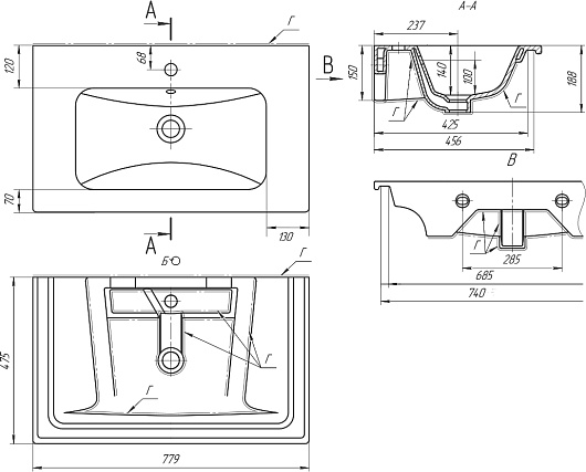 - Раковина из санфаянса со слив-переливом и одним отверстием под смеситель.