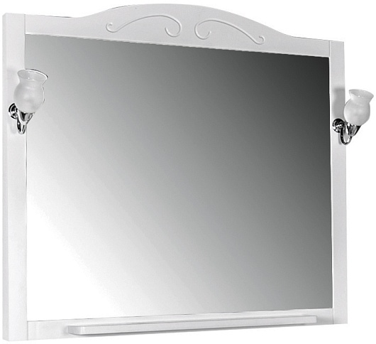 Описание: влагостойкое зеркальное полотно в изысканной раме из массива ясеня, полочка, два светильника.
