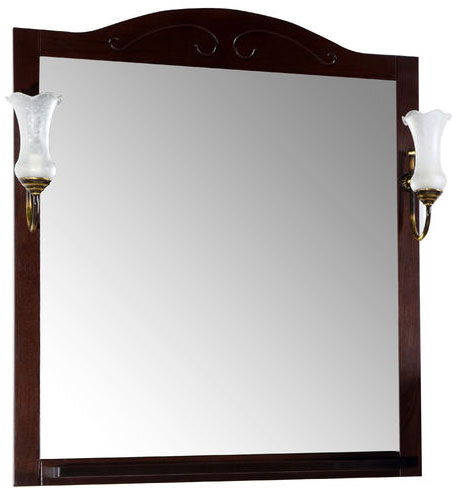 Описание: влагостойкое зеркальное полотно в изысканной раме из массива ясеня, тонированного в глубокий ореховый цвет. Полка для мелочей, светильники.