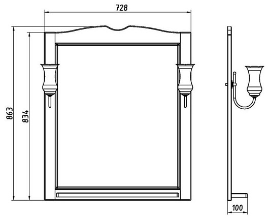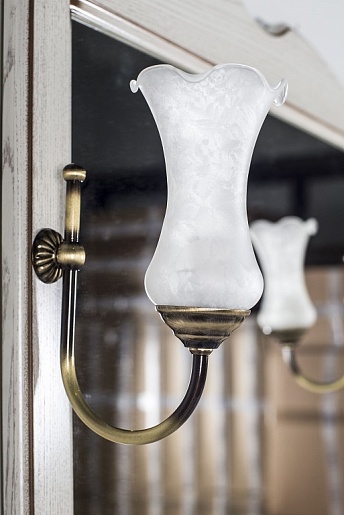 Описание: влагостойкое зеркальное полотно в изысканной раме из массива ясеня, полочка, два светильника.