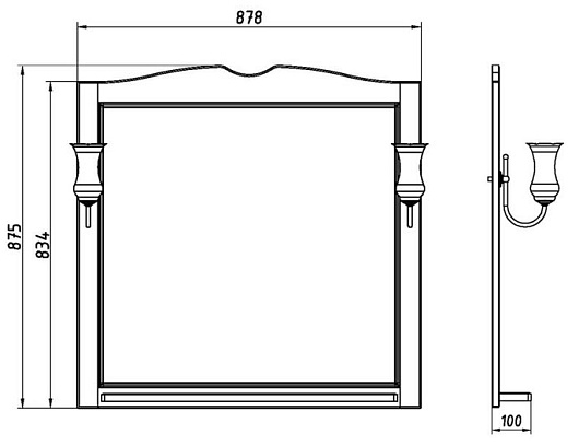 Описание: влагостойкое зеркальное полотно в изысканной раме из массива ясеня, полочка, два светильника.