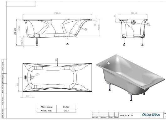 Astra-Form Ванна Вега 170х70, литой мрамор