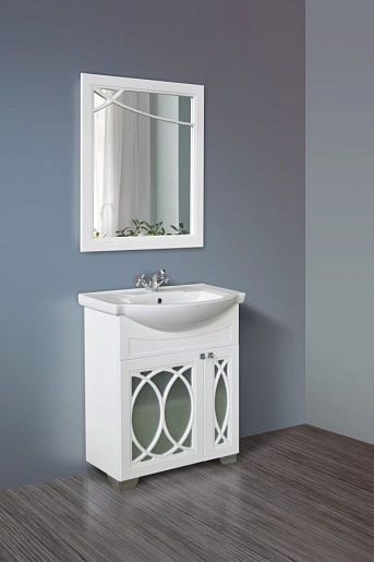 - Тумба под раковину Доминикана 75: распашные фасады с вставками из отпескоструенного стекла.