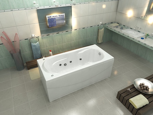 Комплектация: ванна, гидромассажная система, каркас с регулируемыми ножками, крепеж к стене.