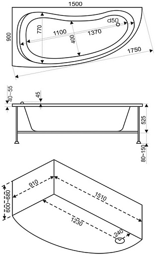 Комплектация: акриловая ванна, каркас с регулируемыми ножками, комплект настенного крепежа, инструкция.