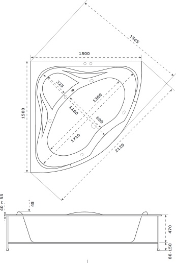 Комплектация: ванна, панель, гидромассажная система, каркас с регулируемыми ножками, крепеж к стене.