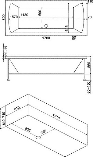 Комплектация: ванна, гидромассажная система, каркас с регулируемыми ножками, крепеж к стене.