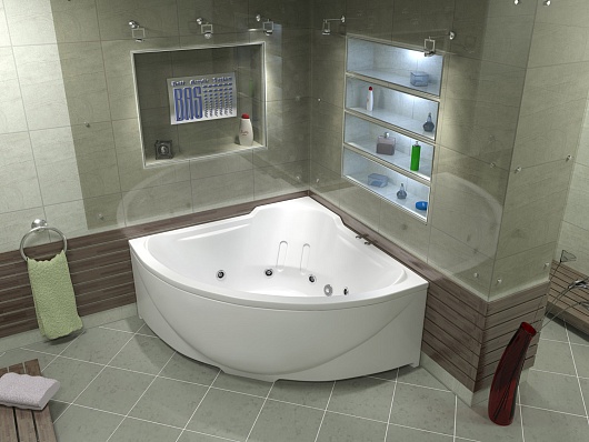 Комплектация: ванна, гидромассажная система, каркас с регулируемыми ножками, крепеж к стене.