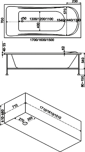 Комплектация: ванна, гидромассажная система, каркас с регулируемыми ножками, крепеж к стене.