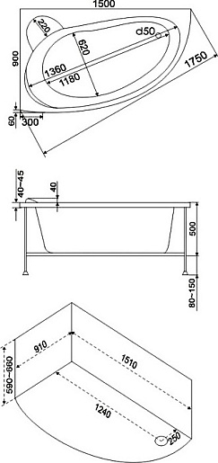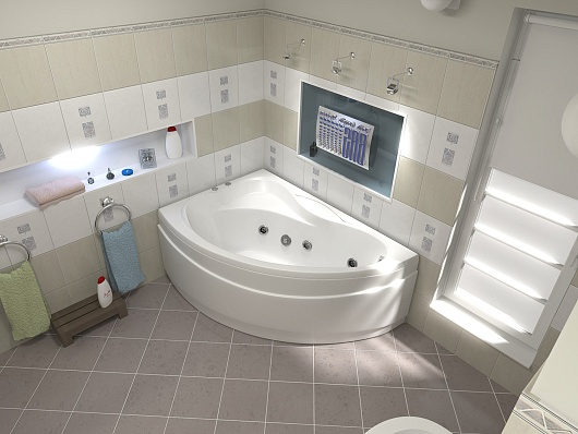 Комплектация: ванна, гидромассажная система, каркас с регулируемыми ножками, крепеж к стене.