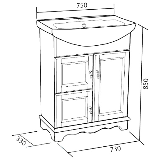 - Тумба с раковиной: раковина Элеганс 75 (Киров), тумба с дверцами, вставки стекло, крашеные фасады из натурального бука, боковины из ламинированного ЛДСП, петли с доводчиками.