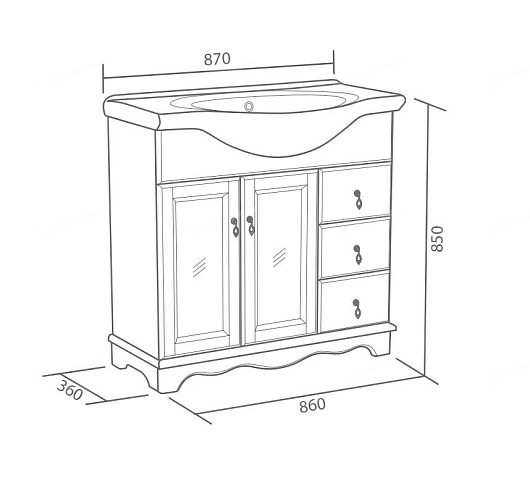 - Тумба с раковиной: раковина Миа 85 (Делла), тумба с дверцами, 3 ящика, вставки стекло, крашеные фасады из натурального бука, боковины из ламинированного ЛДСП, петли с доводчиками.