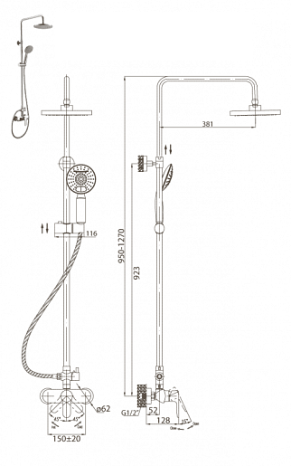Душевая система:Описание: Душевая колонна со смесителем для верхнего и ручного душа.