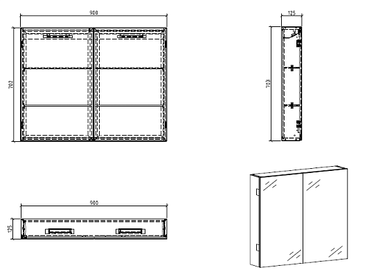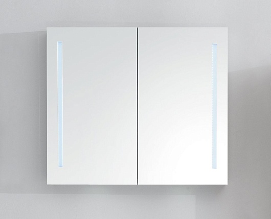 - Зеркальный шкаф с нижней и встроенной LED (светодиодной) подсветкой дверей, с двумя распашными дверьми с двусторонним зеркальным полотном, со стеклянными полками, с розеткой и сенсорным выключателем, 8W, 220-240V, 900x130x700 мм., SPC-2A-DL-BL-900.