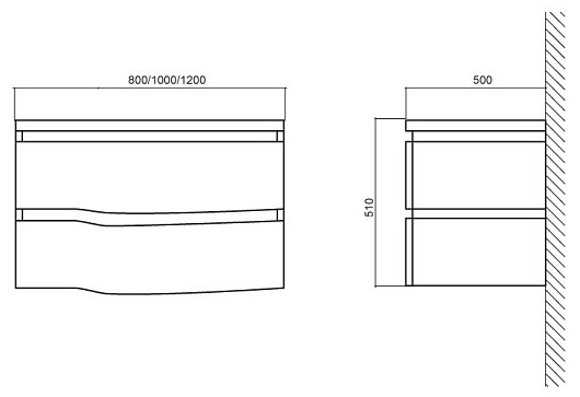 - База под раковину подвесная, с двумя выкатными ящиками, с доводчиками, со скрытыми (фрезерованными) ручками в плоскости фасада, BB800D/TL