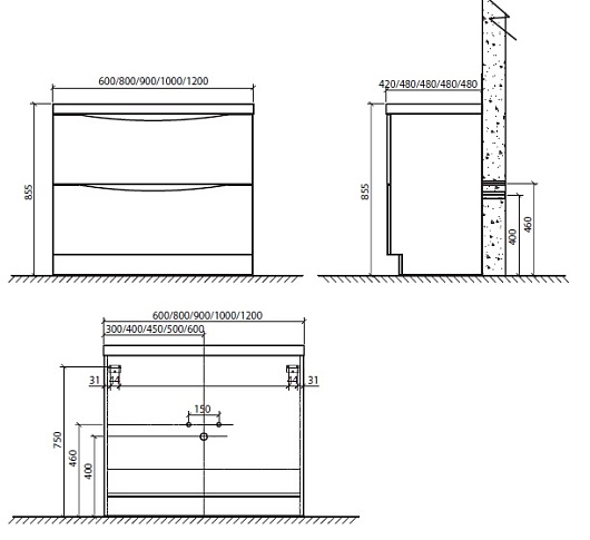 - База под раковину напольная, с двумя выкатными ящиками, с доводчиками, ANCONA-N-600-2C-PIA-RW