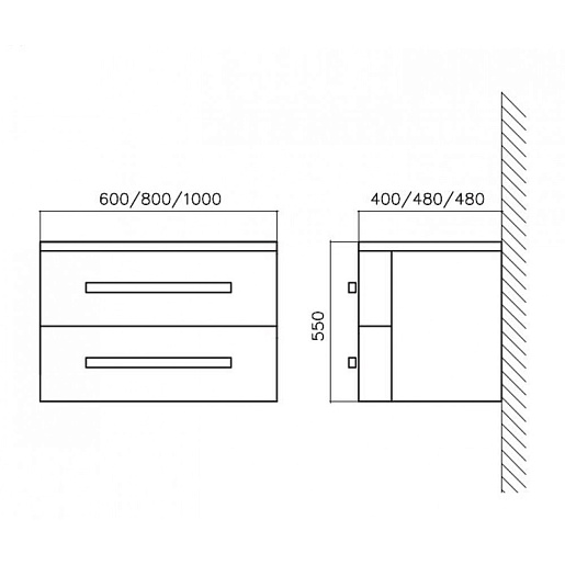 - База под раковину подвесная, с двумя выкатными ящиками, с доводчиками, 800x480x550 мм, BB800DN2C/BL