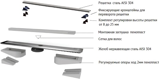 - Решетка, рамка и желоб из нержавеющей стали AISI 304.