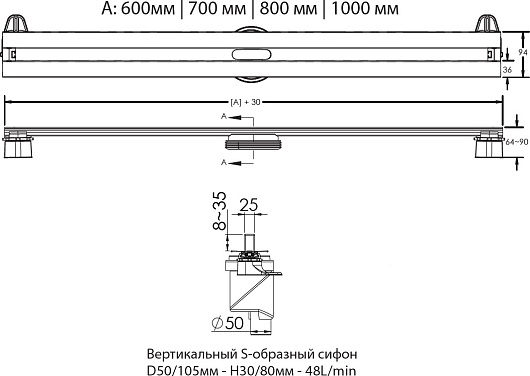 - Самопромывной S-образный сифон PP: вертикальный выпуск D50/105 Н30/105, пропускная способность 48 л/мин, монтаж 360 градусов.