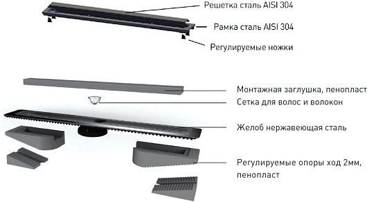 - Решетка, рамка и желоб из нержавеющей стали AISI 304.