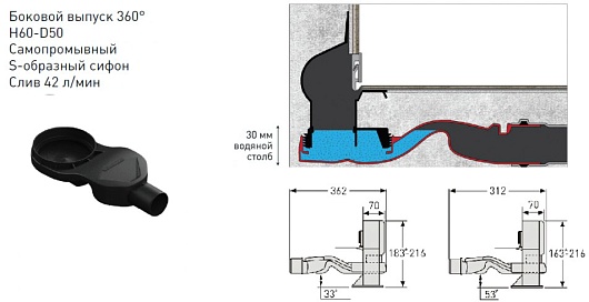 - Самопромывной S-образный сифон PP: горизонтальный выпуск D50 H60, пропускная способность 42 л/мин, монтаж 360 градусов.