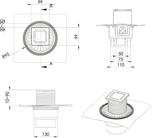 - Самопромывной сифон PP: вертикальный выпуск D50/70/100, пропускная способность 48 л/мин.