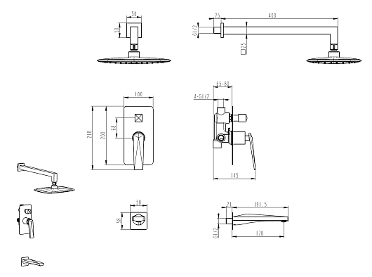Смеситель, лейка, шланг, штанга, верхний душ, крепление
