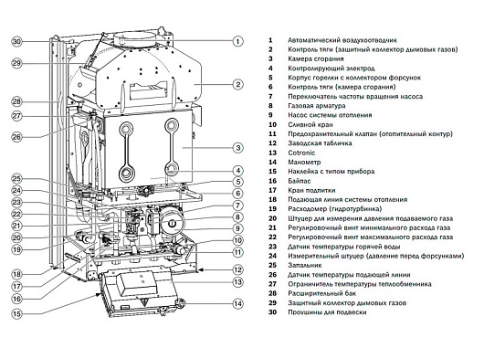 - Комплектация: крепления, кран подпитки системы отопления, насос, манометр, расширительный бак, предохранительный клапан, автоматический воздухоотводчик, датчик ГВС