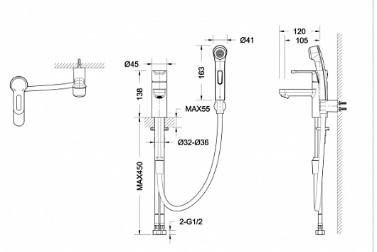 - в комплект входит смеситель, шланг 1500 мм, лейка, настенный держатель.