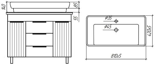 - 2 распашные дверцы, 3 выдвижных ящика.