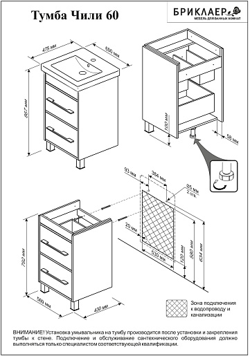 - Тумба с раковиной Бриклаер Чили 60: раковина Комо 60, выдвижной ящик - 2 шт., ручка - 2 шт.