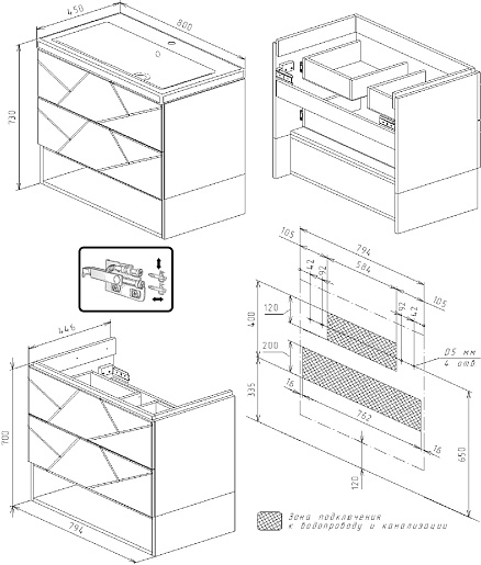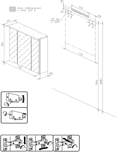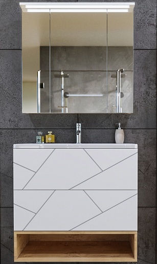 Комплектация: тумба под раковину, раковина, ниша под тумбу, зеркальный шкаф, крепления.