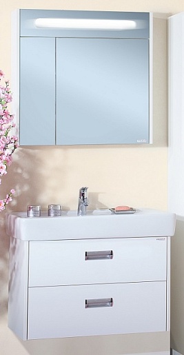 Описание: зеркальный шкаф для ванной с распашными дверцами и внутренней полкой. Встроенный люминисцентный светильник 6 Вт.