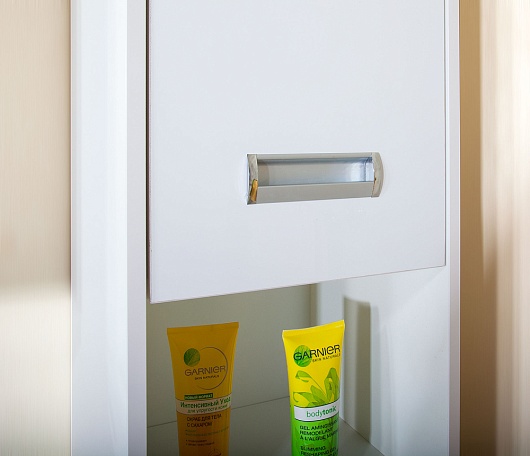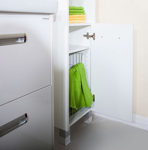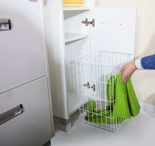 Описание: Напольный пенал для ванной с открытой нишей, двумя распашными дверцами и бельевой корзиной