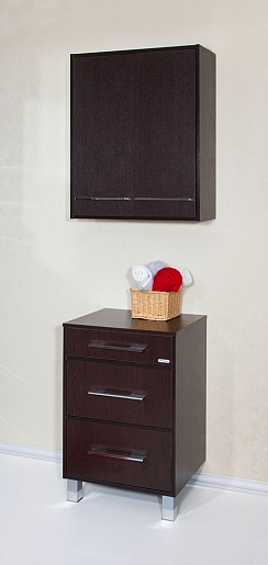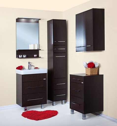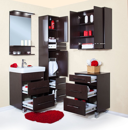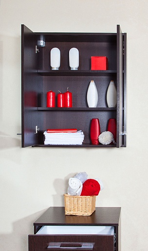 Описание: Подвесной шкаф для ванной с распашными дверцами и внутренними полками. Длинные металлические ручки.